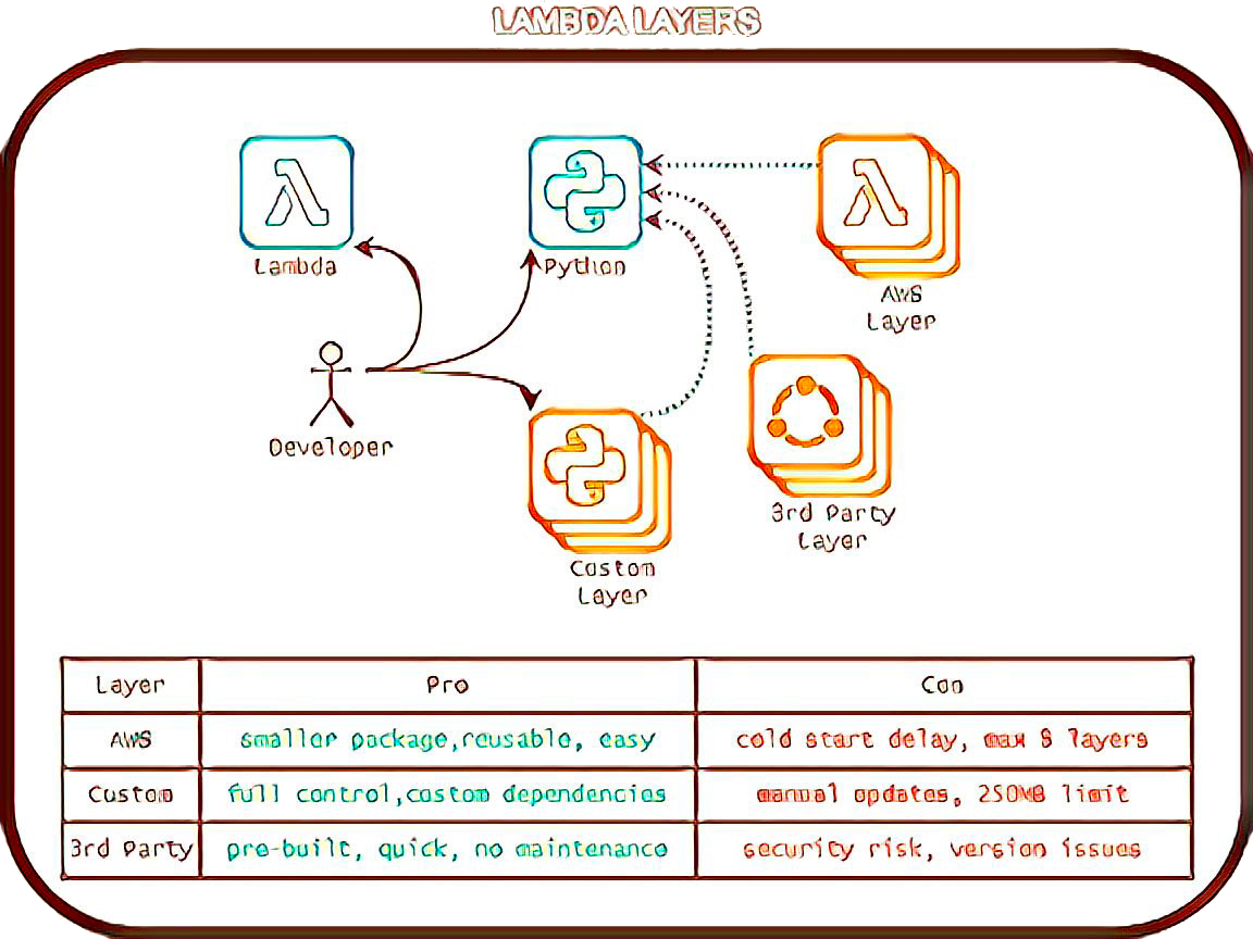 A Lambda layer is basically a packaged set of dependencies that your function can use. Instead of bloating my Lambda function with extra libraries, I figured I’d create a custom layer with all the dependencies I needed. Sounds easy, right? Ha.